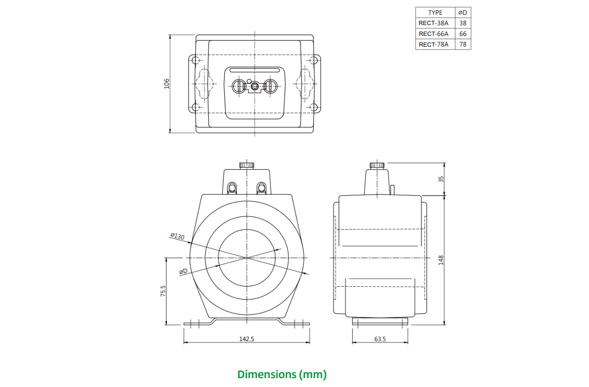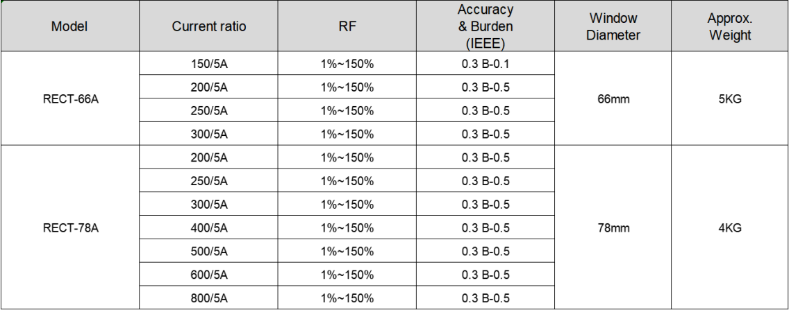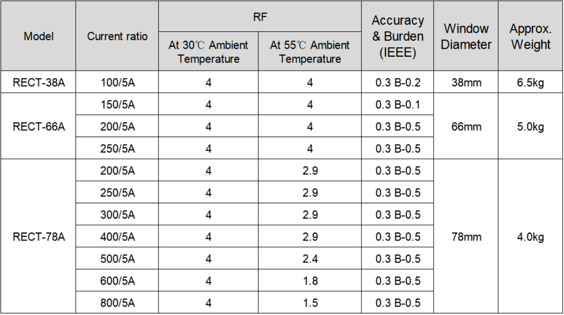 For 600V (max.) power systems, these current transformers offer a 0.3 Metering Class accuracy. RECT specifications also available. Secondary side includes a short-circuiting device. Terminal cover sealable. Various window diameters and current ratios. Ideal for billing in indoor or outdoor applications, they offer ratios from 100:5A to 800:5A, with window diameters of 38mm, 66mm, and 78mm. Standard RECT models have an RF of up to 4.0, while RECT Specifications maintain accuracy and burden rating from 1% to 150% of rated current, exceeding typical metering-class requirements (5% to 100%). All RECT Series transformers are type-tested at Advanced Electricity Lab, meeting rigorous standards.