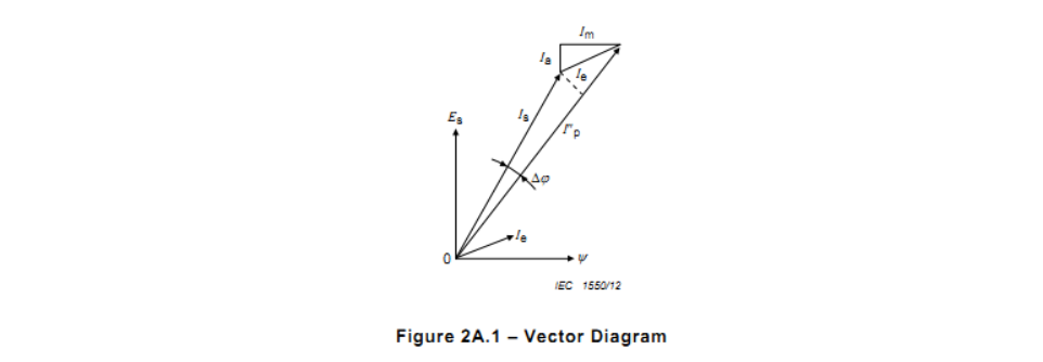 In Figure 2A.1, Is represents the secondary current. It flows through the impedance of the secondary winding and the burden which determines the magnitude and direction of the necessary induced e.m.f. Es and of the secondary linked flux which is perpendicular to the e.m.f. vector. This flux is maintained by the exciting current Ie, having a magnetizing component Im parallel to the secondary linked flux, and a loss (or active) component Ia parallel to the e.m.f.. The vector sum of the secondary current Is and the exciting current Ie is the vector I"p representing the primary current multiplied by the actual turns ratio (number of primary turns to number of secondary turns).