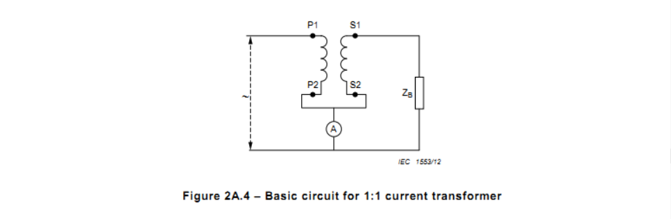 Figure 2A.4 shows a current transformer having a turns ratio of 1:1. It is connected to a source of primary (sinusoidal) current, a secondary burden with linear characteristics and to an ammeter in such a manner that both the primary and secondary currents pass through the ammeter but in opposite directions. In this manner, the resultant current through the ammeter will be equal to the exciting current under the prevailing conditions of sinusoidal primary current, and the r.m.s. value of that current related to the r.m.s. value of the primary current is the composite error according to 3.4.203, the relation being expressed as a percentage.