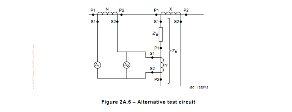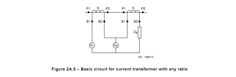 In Figure 2A.6, X is the transformer under test. N is a standard reference transformer with a rated primary current of the same order of magnitude as the rated accuracy limit primary current of transformer X (the current at which the test is to be made). N' is a standard reference transformer having a rated primary current of the order of magnitude of the secondary current corresponding to the rated accuracy limit primary current of transformer X. It should be noted that the transformer N' constitutes a part of the burden ZB of transformer X and must therefore be taken into account in determining the value of the burden ZB. A1 and A2 are two ammeters and care must be taken that A2 measures the difference between the secondary currents of transformers N and N'.
