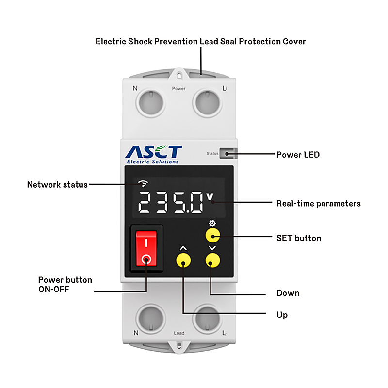The ASCT A1-R-V2 is a smart protection switch featuring an LCD for data monitoring, electricity statistics, and automatic safety functions. Its fire-retardant design and smart chip ensure reliable, networked power control with power-off memory.