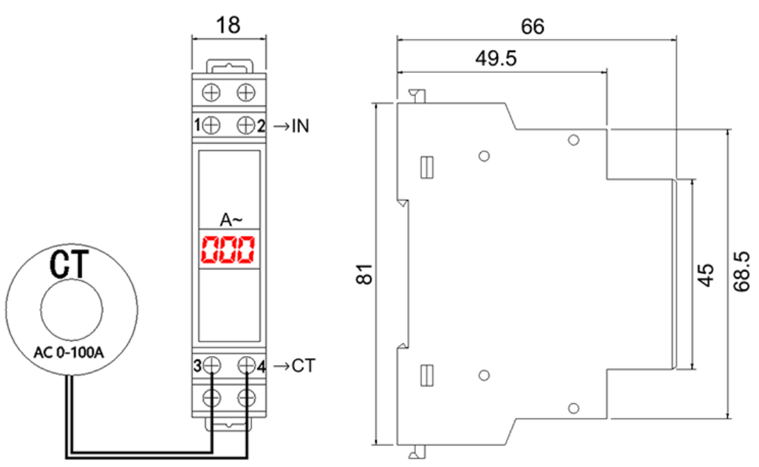 The KA-1P is a DIN-rail current display meter for single-phase systems. It accurately measures AC current from 0-100A with ±2% accuracy, featuring a clear red display for easy monitoring in electrical panels.